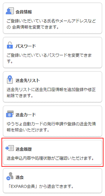 送金申込内容や進捗状況の確認、結果報告書などのダウンロードなどが可能です。