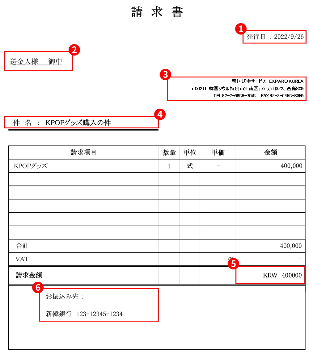 エクスパロでは、日本の外為法、犯収法並びに韓国の関係法に基づき、20万円を超える商品購入、サービス利用など商取引を目的とした送金については、お取引の証明となるインボイスを確認させていただいていおります。