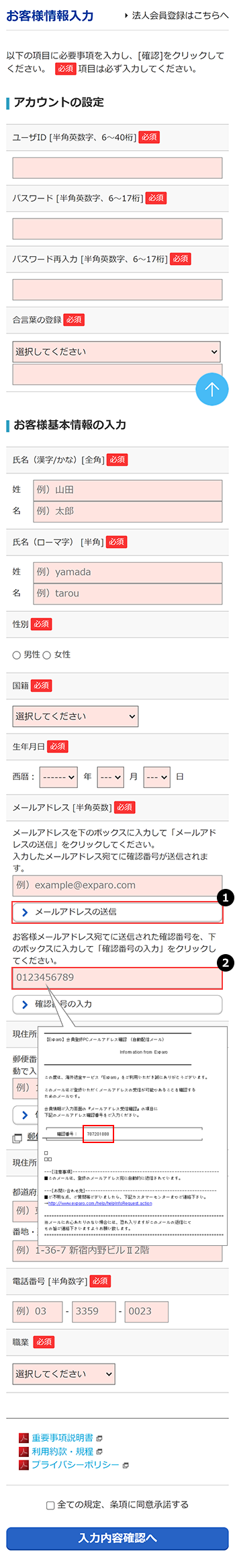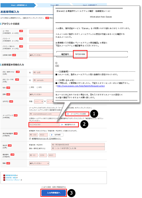 1. [メールアドレスの送信]ボタンをクリックすると、メールアドレス欄に入力したメールアドレス宛てに「会員登録メールアドレス確認」メールを送信されます。2. 受信したメール本文中の「確認番号」を入力して「確認番号の入力」ボタンをクリックしてください。