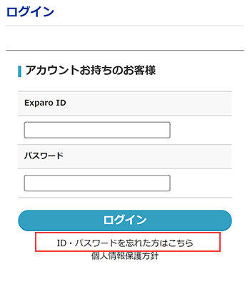 「ログイン」ページで、[ユーザID・パスワードを忘れた方はこちら]を押します。