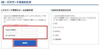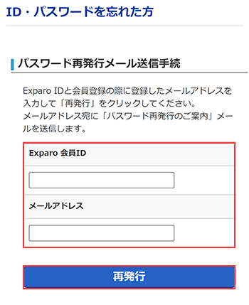 ユーザIDと会員情報としてご登録いただいたメールアドレスを入力し、[再発行]ボタンを押します。