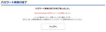 入力したユーザIDとメールアドレスが正しい場合、パスワード再発行完了画面が表示されます。