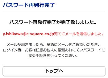 登録のメールアドレスに「パスワードの再発行について」メールが送信されます。