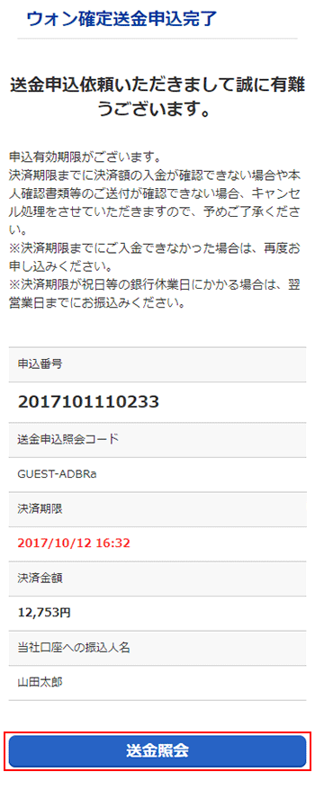 ウォン確定送金申込画面操作方法(ゲスト会員)