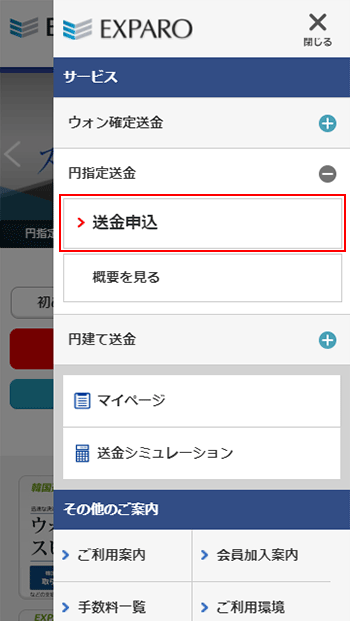 メニューボタンから[円指定送金]⇒[送金申込]をクリックします。