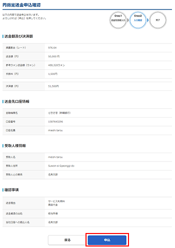 - ※受け取り銀行により1~3万ウォンの支払銀行手数料が発生します。