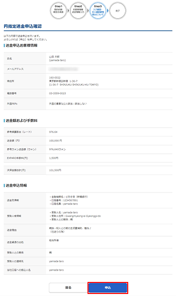 円指定送金申込内容確認