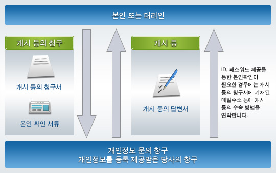 ※‘개인정보의 공개 등’이란 개인정보의 보호에 관한 법률(이하 ‘개인정보보호법’이라 함.)에 규정된 개인정보의 공개, 이용 목적의 통지, 개인정보의 정정・추가・삭제, 개인정보의 이용정지・삭제・제3자 제공의 정지 를 말합니다.