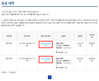 지금까지의 신청 내역이 전부 표시됩니다. 송금신청번호를 누르면 송금내역이 상세 표시됩니다.