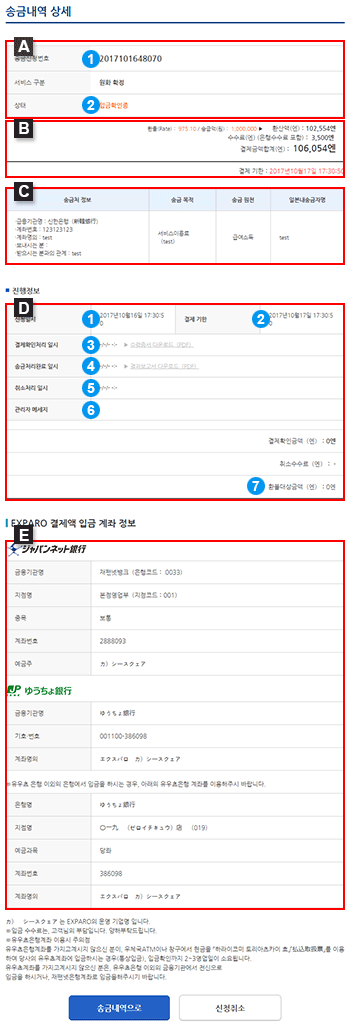 송금결과보고서:송금이 완료된 경우, 송금결과 보고서가 발행 됩니다. PDF파일로 다운로드 하실 수 있습니다. 단, 송금계좌 불명, 계좌명의 상이 등의 이유로 송금불능이 된 경우, 이메일로 안내해 드립니다. - 송금실시 환율(엔 지정 송금의 경우)
