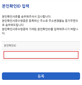 본인확인ID인증 절차는 [본인확인서류 수령서]가 도착하신 시점부터 가능합니다.