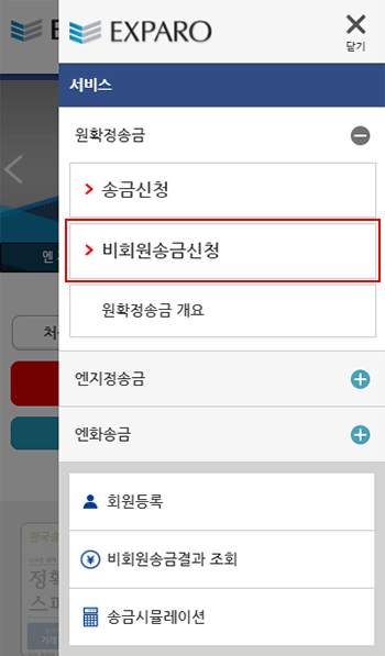 메인페이지 또는 서비스 소개 페이지 등의 메뉴에서 「원화 확정 송금신청」>[비회원 송금신청]을 눌러주세요.