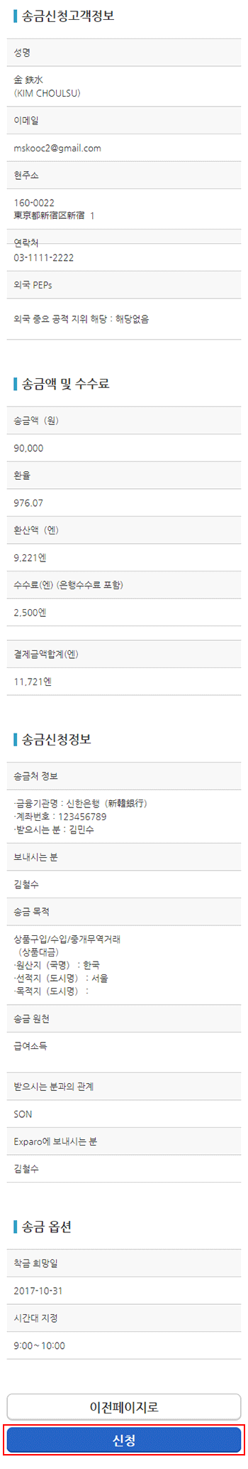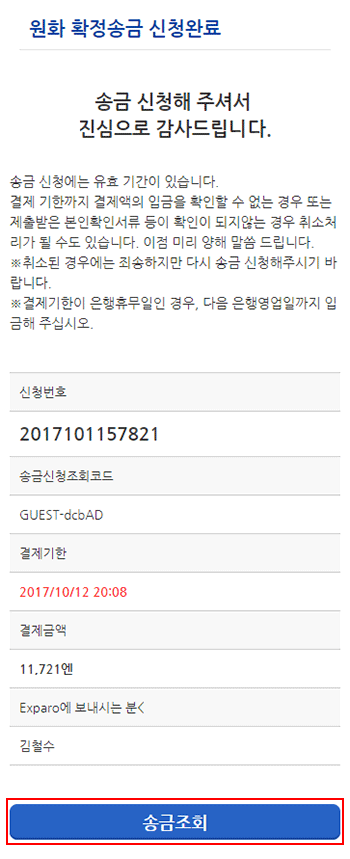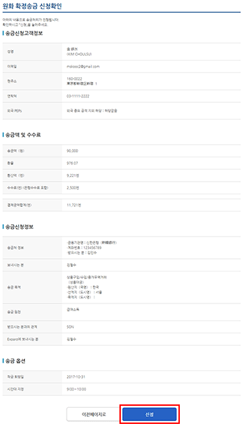 송금신청 내용에 틀림이 없는지 확인해 주시기 바랍니다.