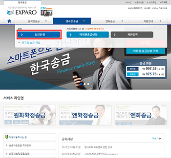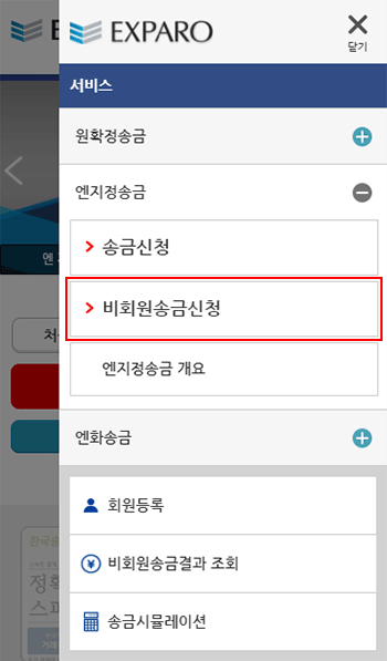 메인페이지, 서비스 소개 페이지 등의 메뉴에서 「엔 지정 송금신청」>[비회원 송금신청]을 눌러주세요.