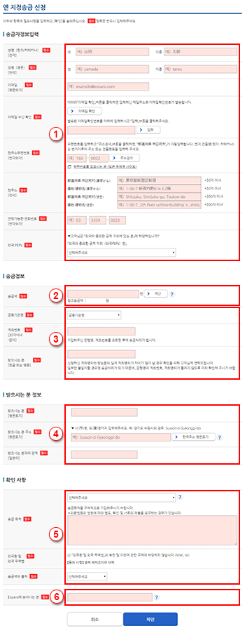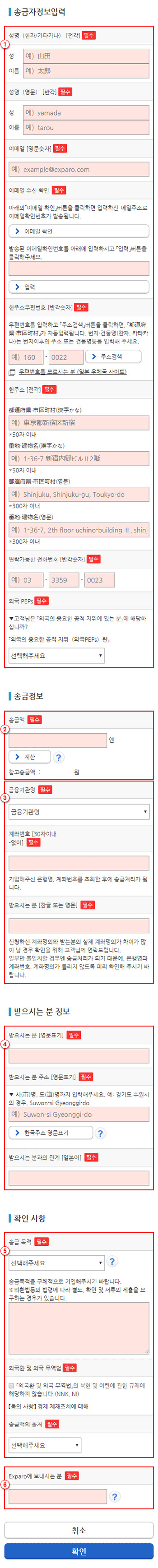 송금인 정보, 송금 금액, 송금처계좌 정보등 필수 사항을 폼에 맞게 입력해 주시기 바랍니다.