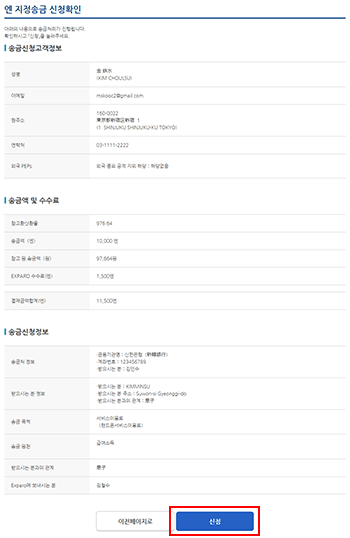 송금신청 내용에 틀림이 없는지 확인해 주시기 바랍니다.