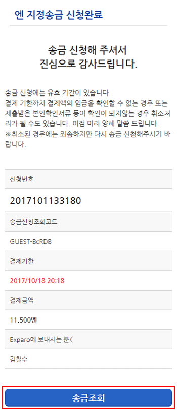 또는, 비회원 송금신청 확인 페이지에서 확인이 가능합니다.