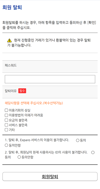 - ■ 환불 대상 금액에 대해 환불 신청이 되어 있지 않은 경우, 탈퇴할 수 없습니다.